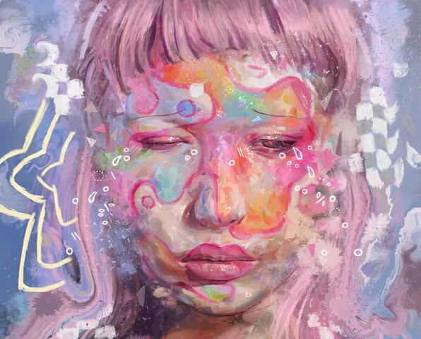 at the time of this painting, I was employed but out of work temporarily while waiting to be seen by a neurological unit to investigate my sudden onset seizures. I was fired shortly before I finished.The work in particular is meant to visualise experiencing pre-ictal stages of an oncoming seizure. before my sudden onset, these symptoms would mean I was going to faint, but now it had transformed into meaning I was about to lose consciousness, either to collapse and convulse OR to lose consciousness, but still appear awake and moving. During this period of time, I was almost certain that this sudden degredation of my health meant I was going to die.Feelings of fear, frustration and a general sense of a loss of control is all present here. The following months before I'd drawn this, I had grown increasingly aware of my health slowly yet rapidly spiraling, within less than a year, I'd lost the ability to walk for my than 15 minutes. lost the ability to dance for longer than a few seconds. I had already lived my whole life with autism, and was used to the feeling of being different, not in the unique way, but being able to adjust yourself to fit in, physically, socially, verbally, yet still being othered- but when my brain started turning on itself and the rest of my body, it was an entirely new level of seclusion. If I could not speak the same as others, I could still walk the same as others, go to parties like others. No amount of makeup or masking could hide my differences now.