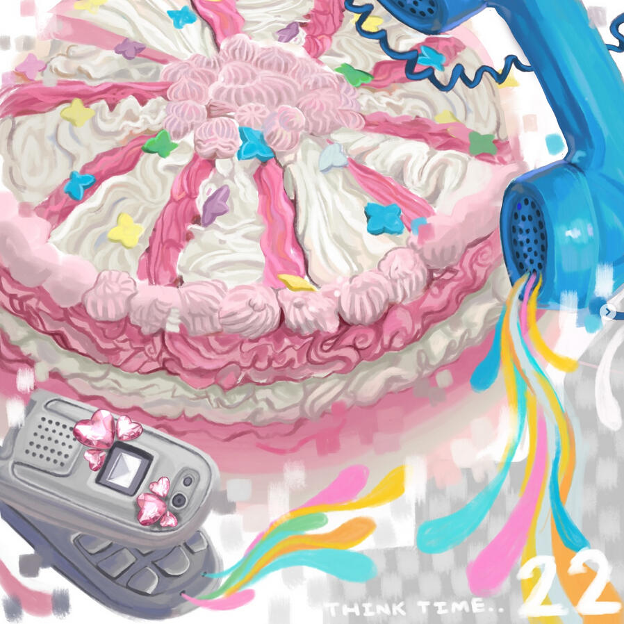As I have grown older, I have begun to view birthdays less as a simple event and more of a near obsessive need to perfectly capture something, of which I'm not entirely sure. Since I was 14, I've created birthday portraits of myself to mark my growth both visually, emotionally and artistically - I am constantly reflecting on previous years and have a desperation to perform better than before, THINKTIME22 was a reflection of that, with the old and new phones calling out towards eachother but never connecting and a cake that is somewhat fading into pixels.
