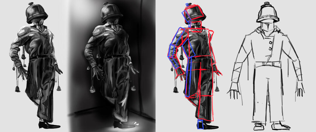 rough concept of the bellmanThe Bellman is a monster in the game hotel 1801 that forces the player to be careful with the noise they make in-game. His design is that of a hotel bellman, with literal bells both on his head and arms attached with suffocatingly tight string. His initial concept contained a lot of detail, but translating this into a 'low poly' styled monster required some alteration and simplification. His rough silhouette on the right side was used as a turnaround reference for the modelling process, with the small bell features on his arms removed.